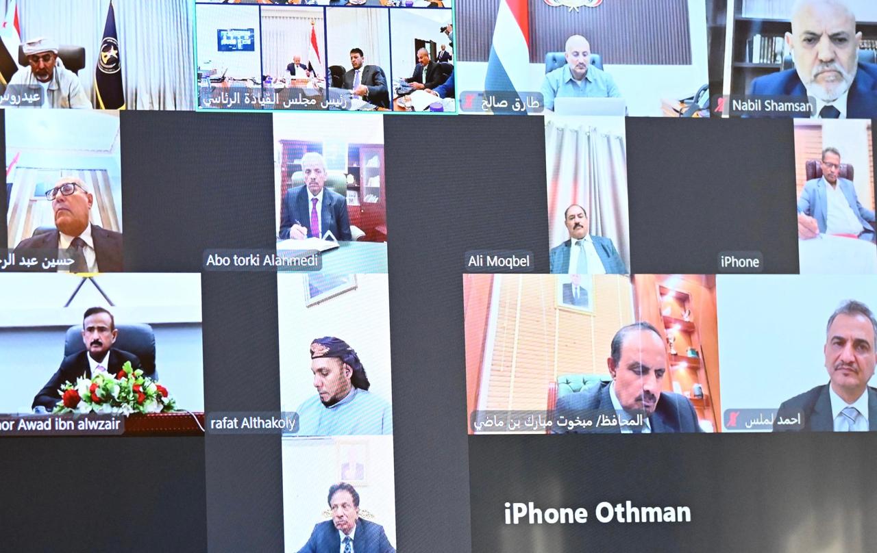 The Presidential Leadership Council held a meeting today, Wednesday, chaired by His Excellency President Dr. Rashad Mohammed Al-Alimi, President of the Council. The meeting was attended by Council members: Sultan Al-Arada, Abdulrahman Al-Mahrami, and Dr. Abdullah Al-Alimi. Through video conference, members Aidarous Al-Zubaidi, Tariq Saleh, and Othman Mujalli also participated.