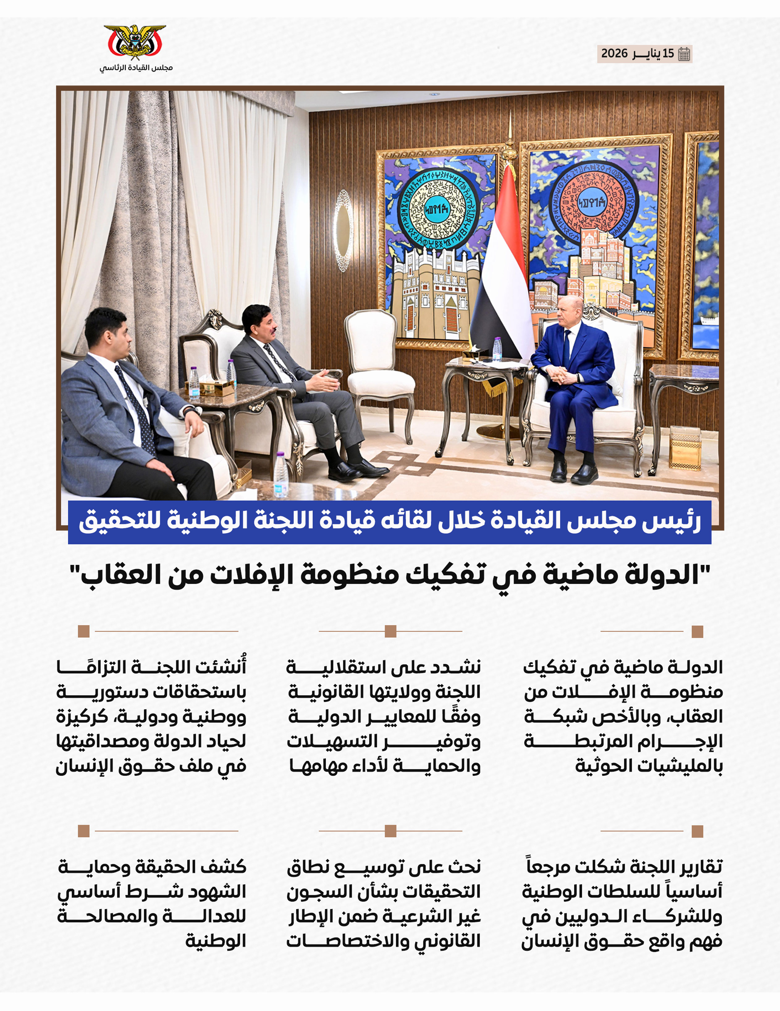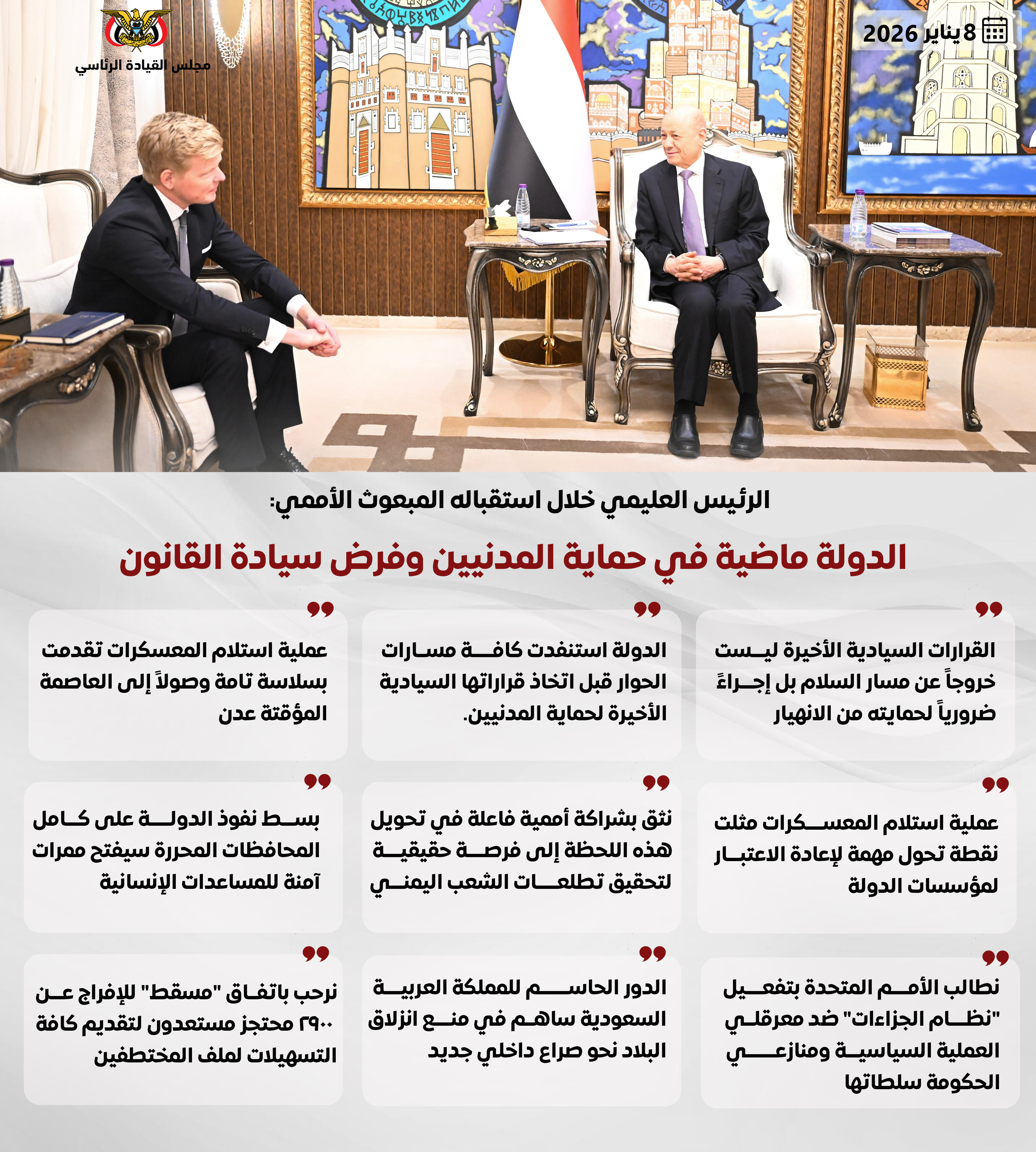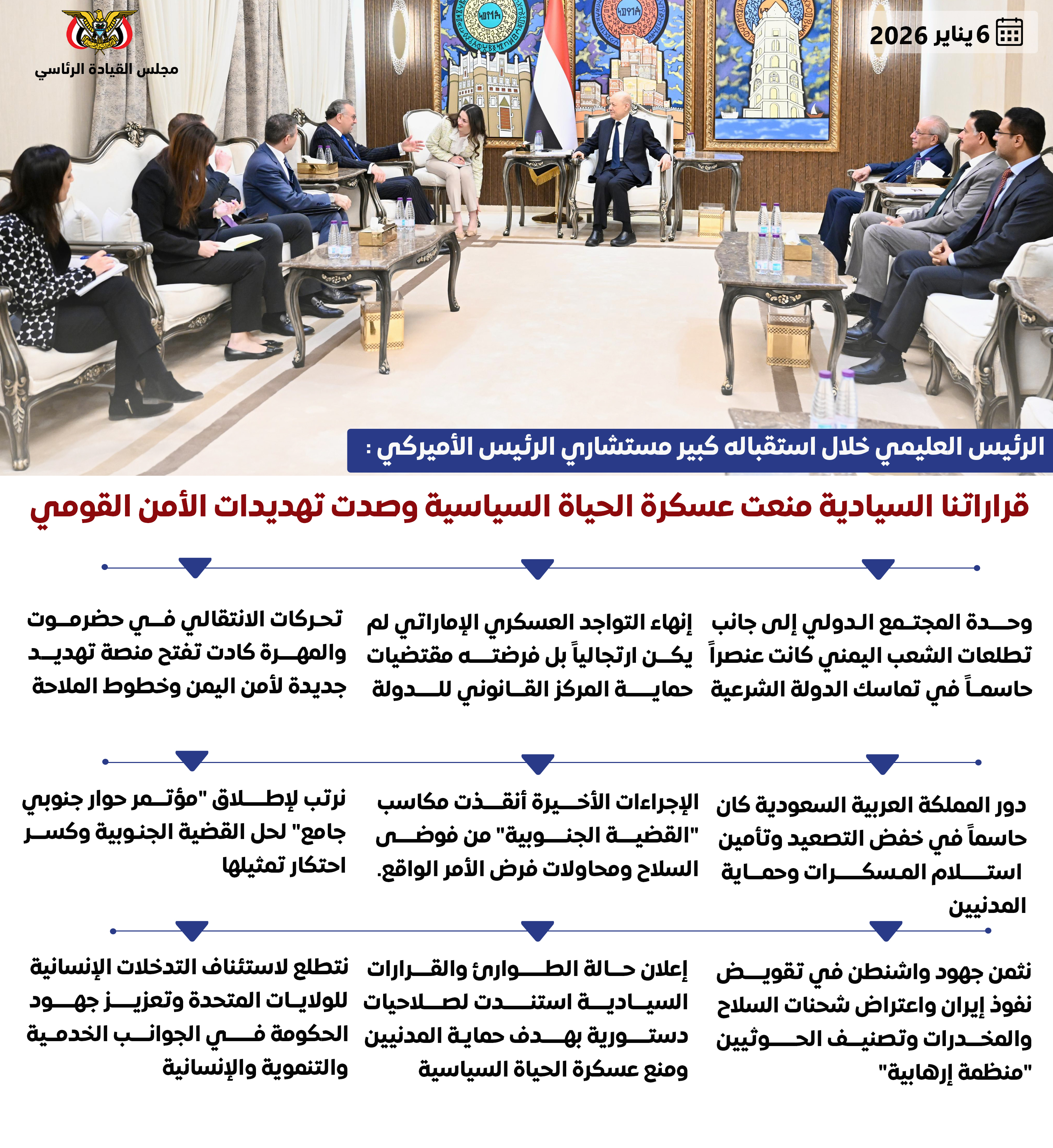 دعا فخامة الرئيس الدكتور رشاد محمد العليمي رئيس مجلس القيادة الرئاسي، ابناء الشعب اليمني الى التقاط فرصة التحولات الجديدة في البلاد، والانحياز إلى الحكمة، وتغليب استحقاقات المستقبل، وبناء دولة تتسع للجميع، تحمي الحقوق، وتصون الكرامة، وتفتح أبواب الأمل أمام اجيالها المتعاقبة.