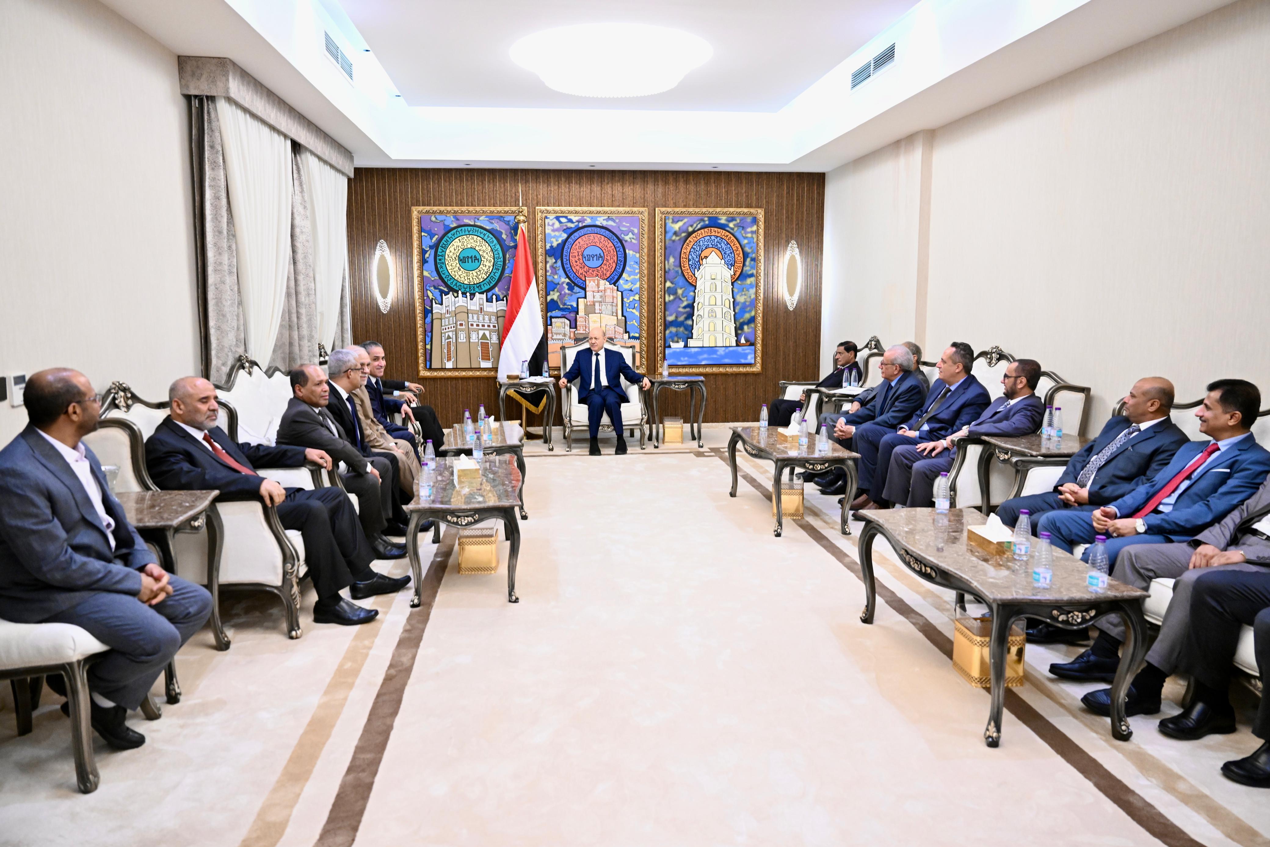His Excellency President Dr. Rashad Mohammed Al-Alimi, President of the Presidential Leadership Council, along with Council member Major General Faraj Al-Buhsani, met today, Thursday, with the leadership of the National Bloc of Political Parties and Components, headed by Dr. Ahmed Obeid bin Daghr, Chairman of the Shura Council. The discussions focused on the latest local developments and the role of national forces in supporting comprehensive reform efforts, as well as the coordinated monetary and fiscal policies and measures recently adopted by the government and the Central Bank, along with their positive impact on the national currency's stability and the prices of essential goods.