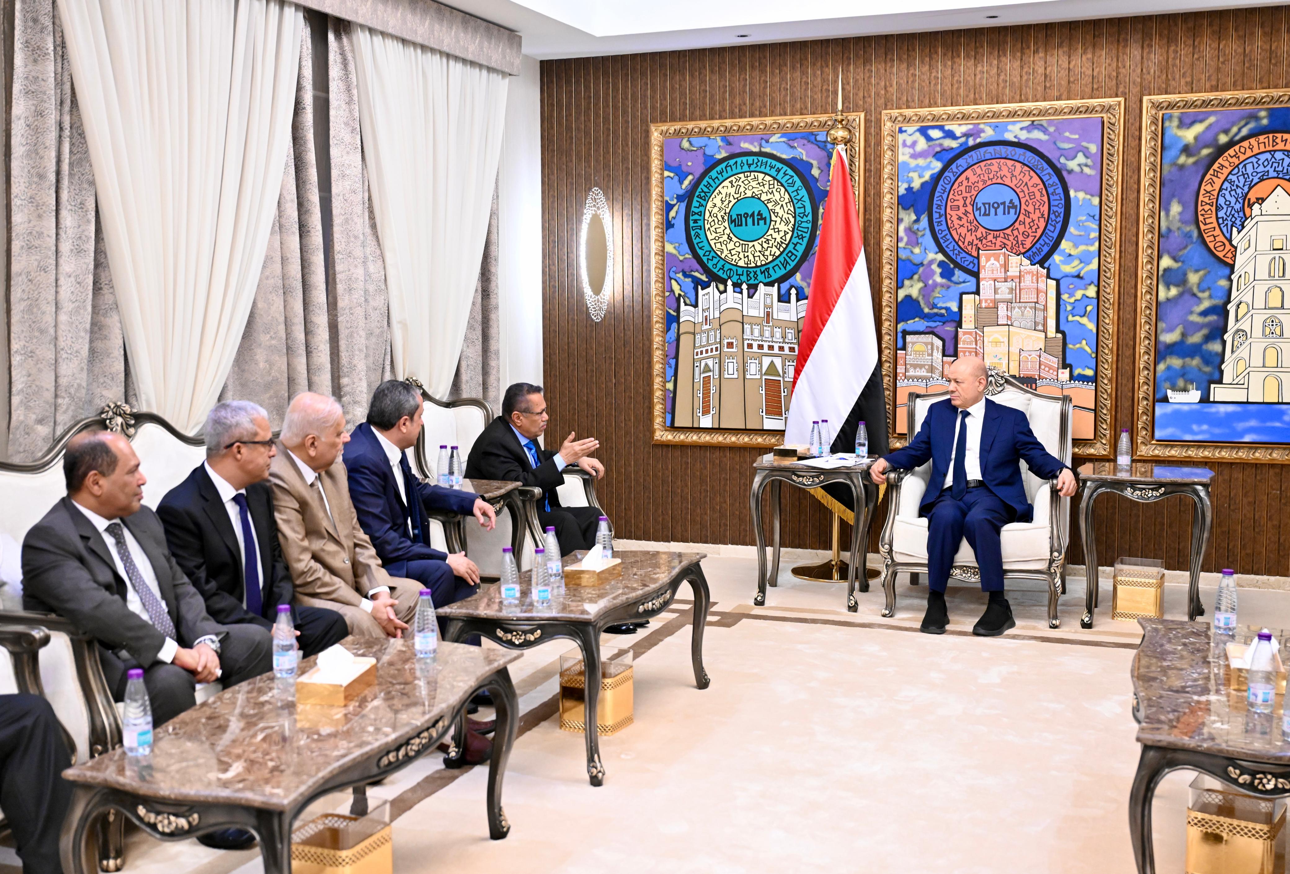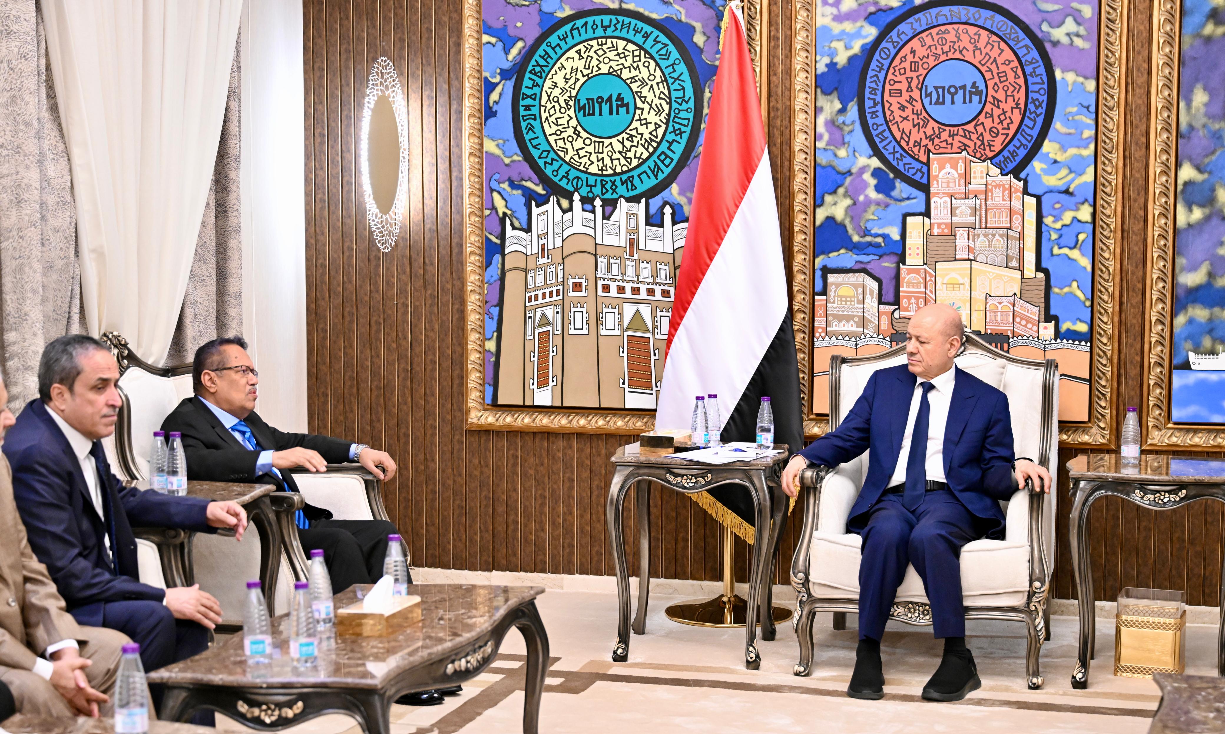 In this context, the President explained that the Presidential Leadership Council and the government are working in coordination with the brotherly and friendly partners to advance comprehensive reforms and restore international confidence—particularly concerning redoubling development interventions and humanitarian assistance for the Yemeni people.