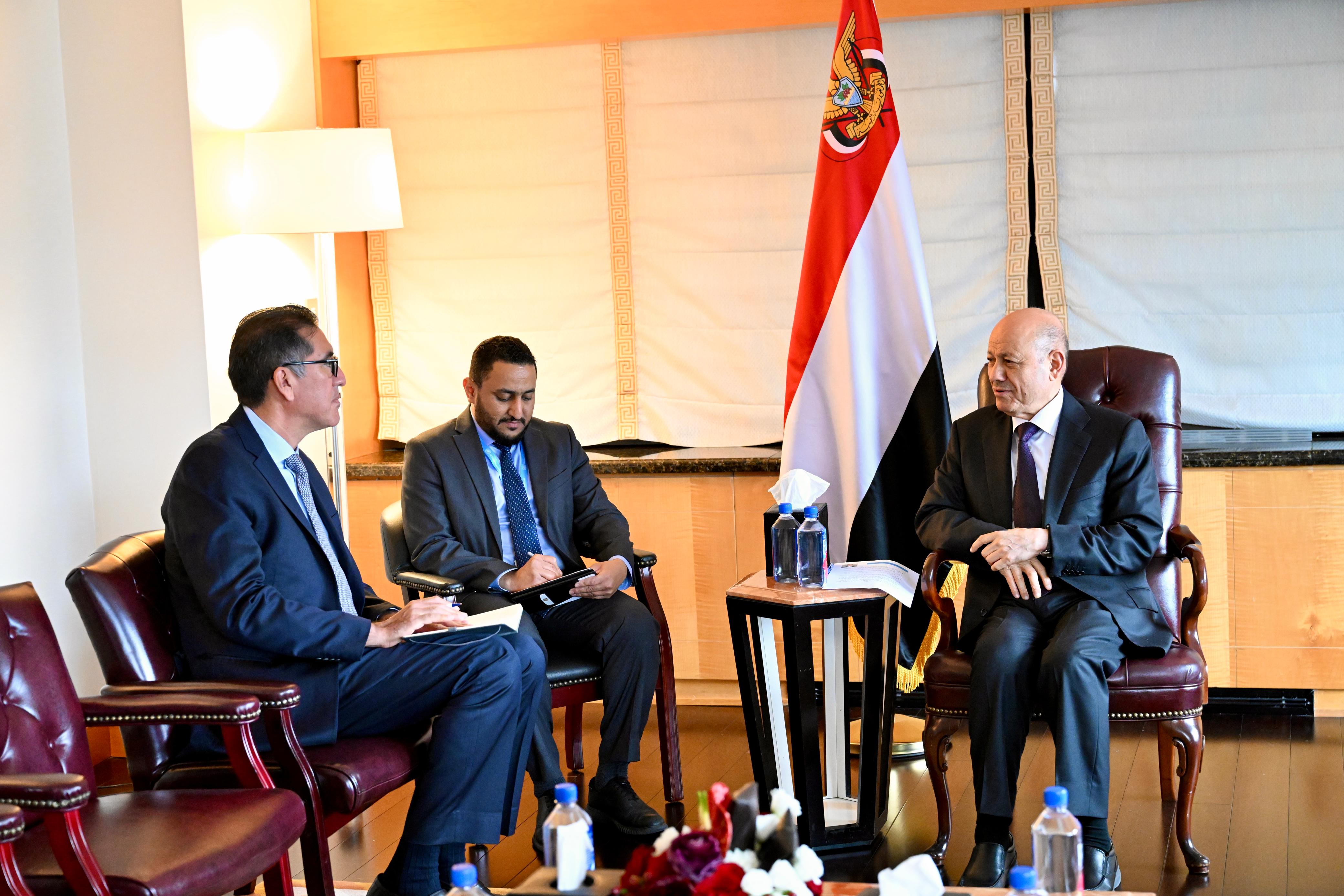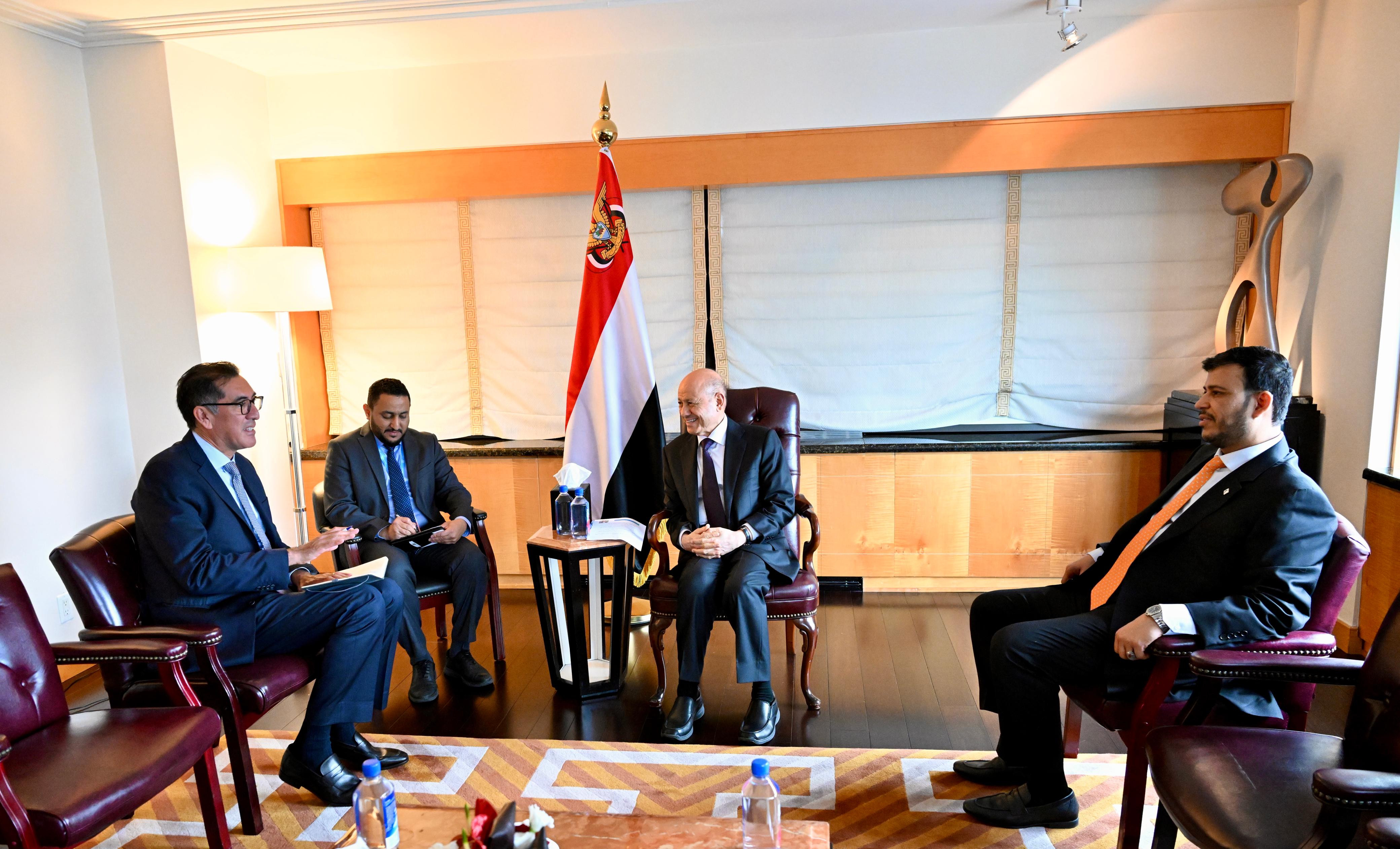 His Excellency President Dr. Rashad Mohammed Al-Alimi, President of the Presidential Leadership Council, along with Council Member Dr. Abdullah Al-Alimi, received today in New York Mr. Igor Salazar senior vice president of US Hunt Oil Company.