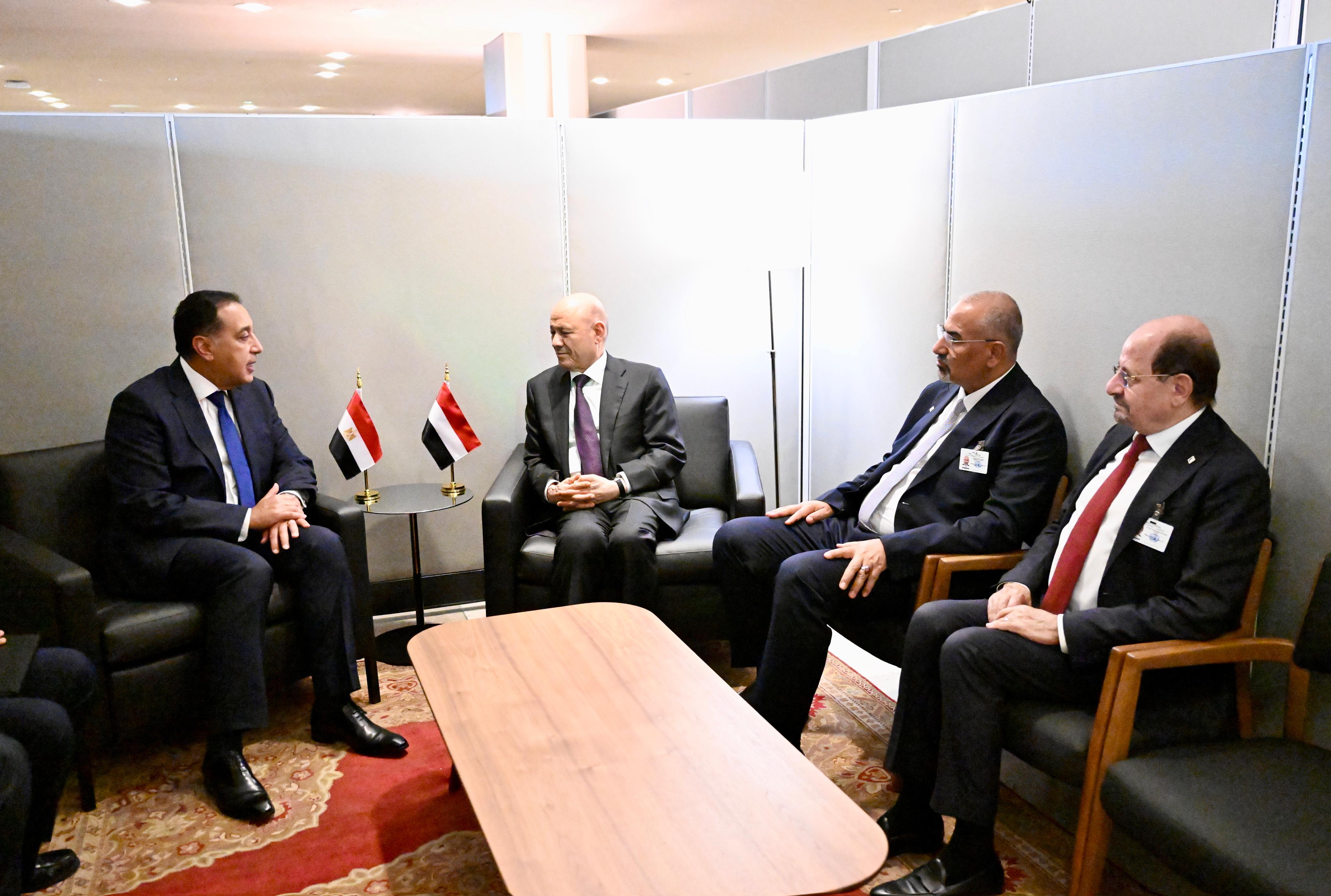 His Excellency President Dr. Rashad Mohammed Al-Alimi, President of the Presidential Leadership Council, along with Council Member Major General Aidarous Al-Zubaidi, received today, Tuesday, Dr. Mostafa Madbouly, Prime Minister of the Arab Republic of Egypt, on the sidelines of the United Nations General Assembly sessions.