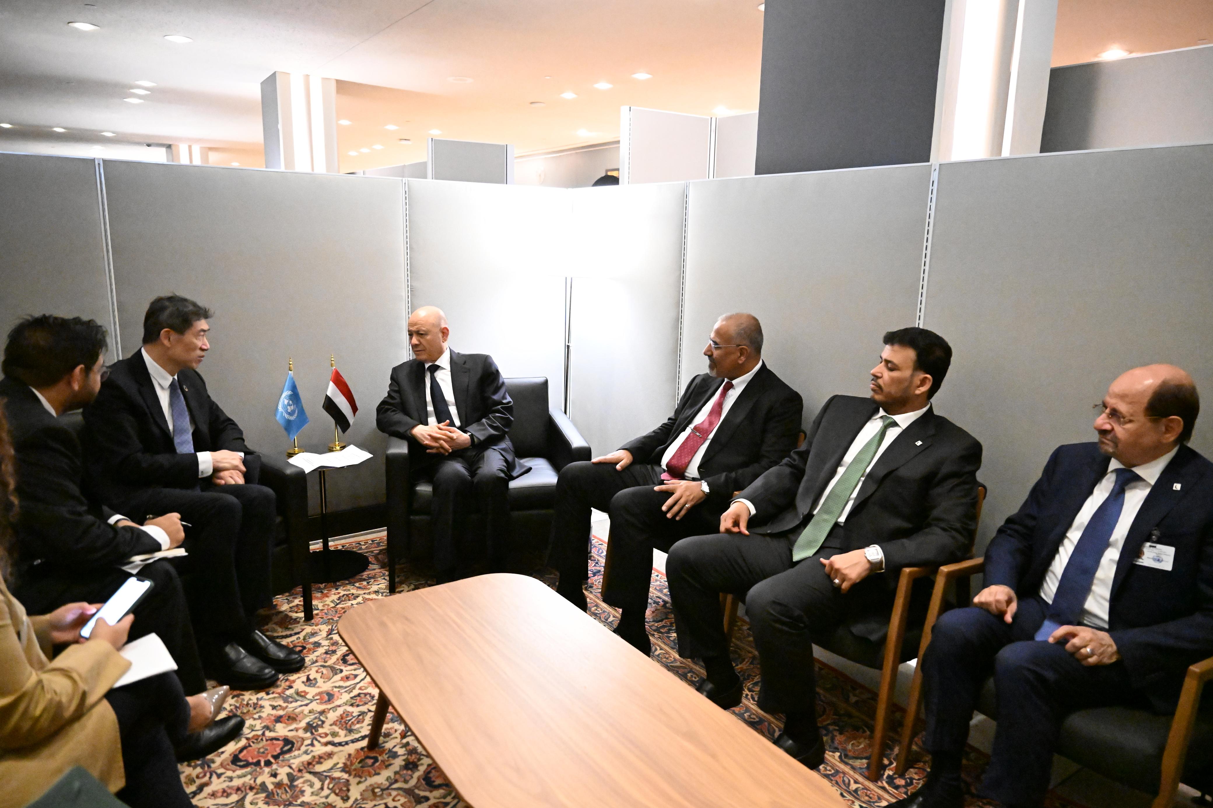 His Excellency Dr. Rashad Mohammed Al-Alimi, President of the Presidential Leadership Council, along with Council Members Major General Aidarous Al-Zubaidi and Dr. Abdullah Al-Alimi, received today, Thursday, in New York, Mr. Haoliang Xu, Acting Administrator of the United Nations Development Programme (UNDP). The meeting took place on the sidelines of the 80th session of the United Nations General Assembly.