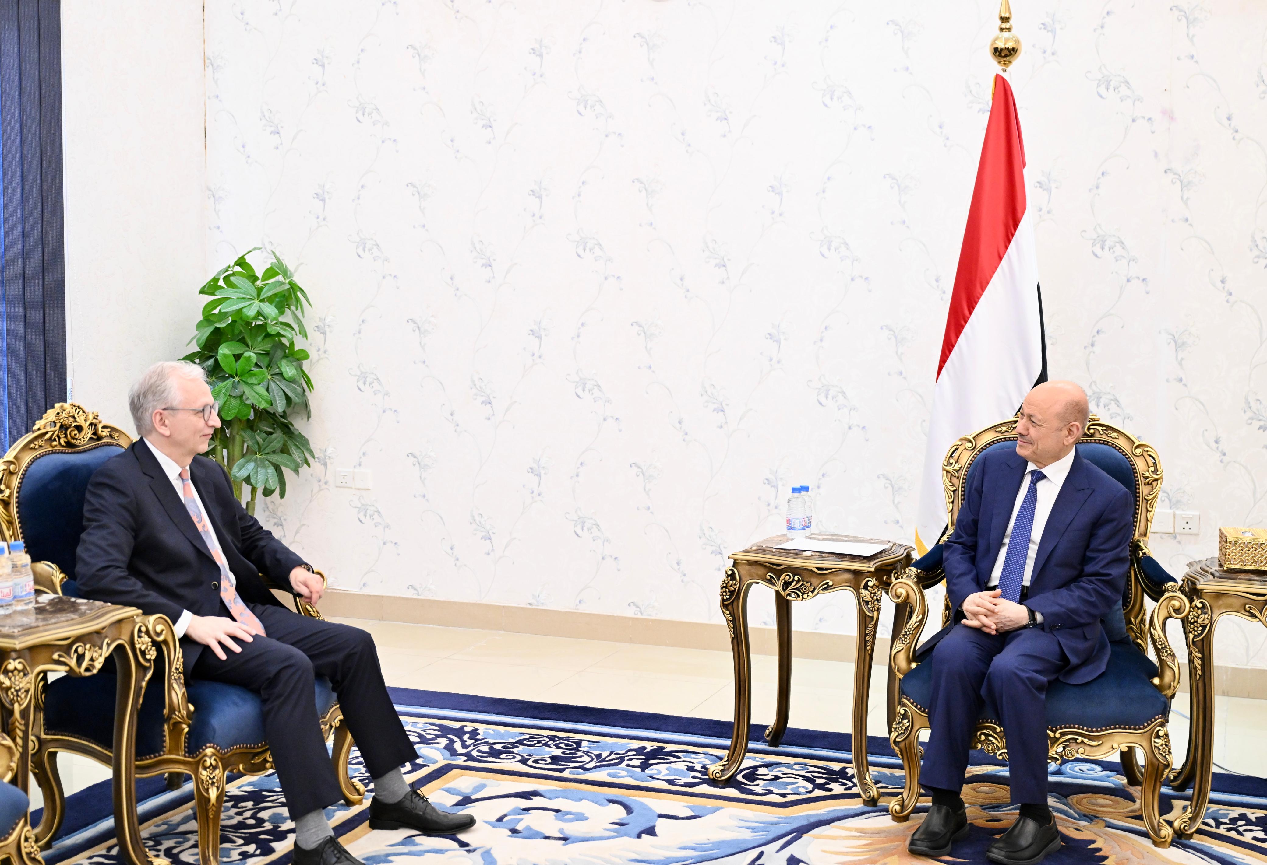 President Dr. Rashad Mohammed Al-Alimi, President of the Presidential Leadership Council, received today, Wednesday, at the Ma’ashiq Palace, Mr. Thomas Schneider, the Ambassador of the Federal Republic of Germany to Yemen.