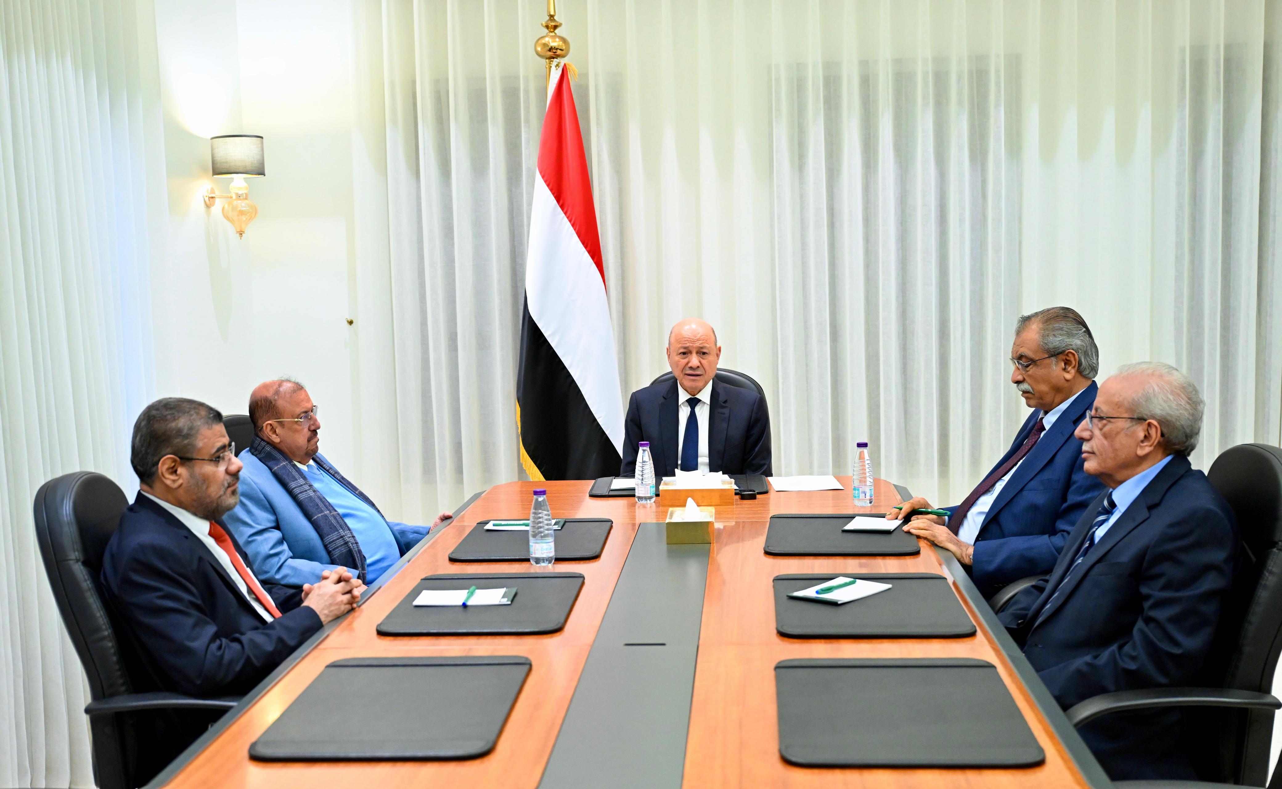 Excellency Dr. Rashad Mohammed Al-Alimi, President of the Presidential Leadership Council, met today, Thursday, with the Speaker of Parliament, Sheikh Sultan Al-Barakani, and members of the Parliament’s Presidency, Mohammed Al-Shaddadi and Mohsen Basarah.