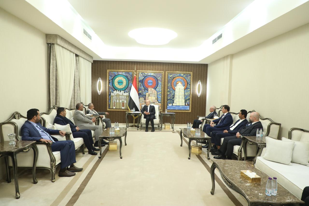 His Excellency Dr. Rashad Mohammed Al-Alimi, President of the Presidential Leadership Council, today Thursday, received the government negotiating delegation concerned with the detainees file, headed by Mr. Hadi Heij, member of Shura Council.