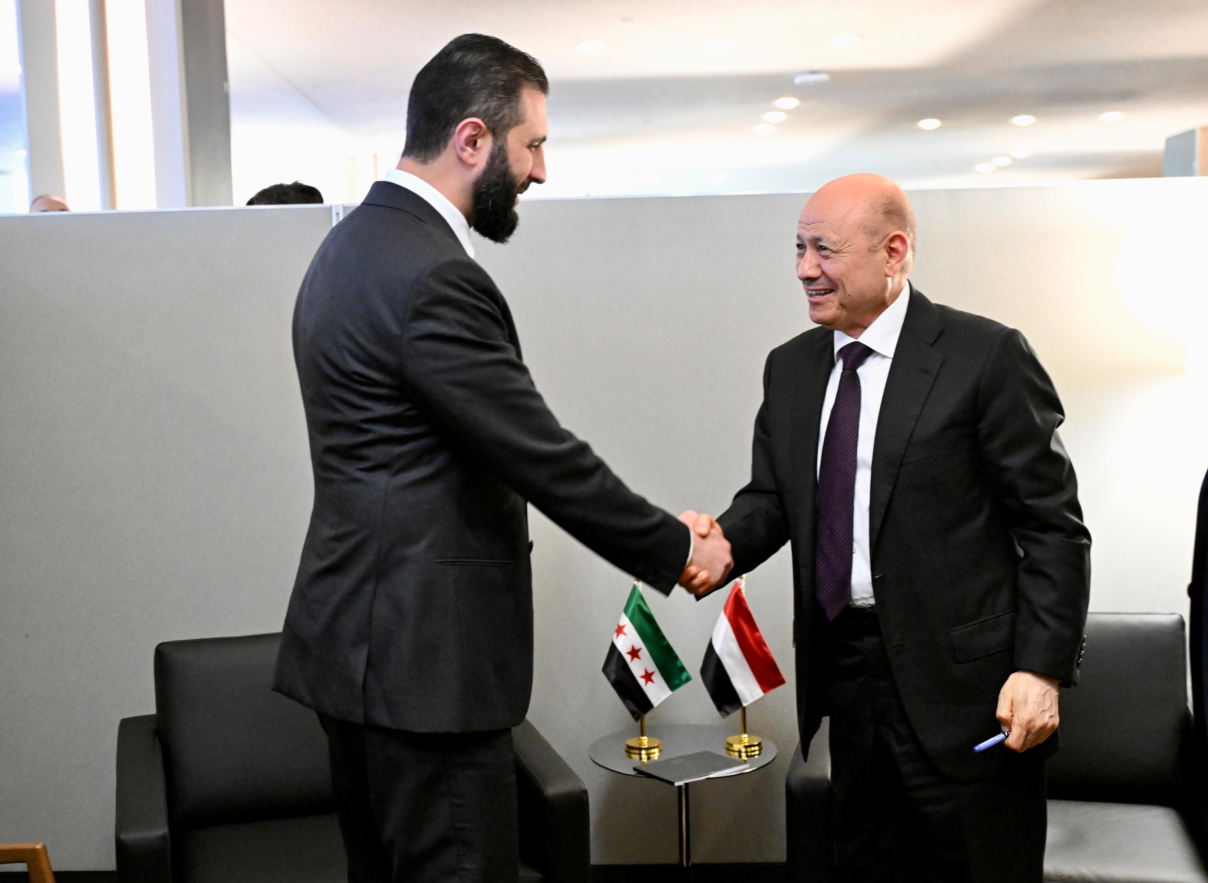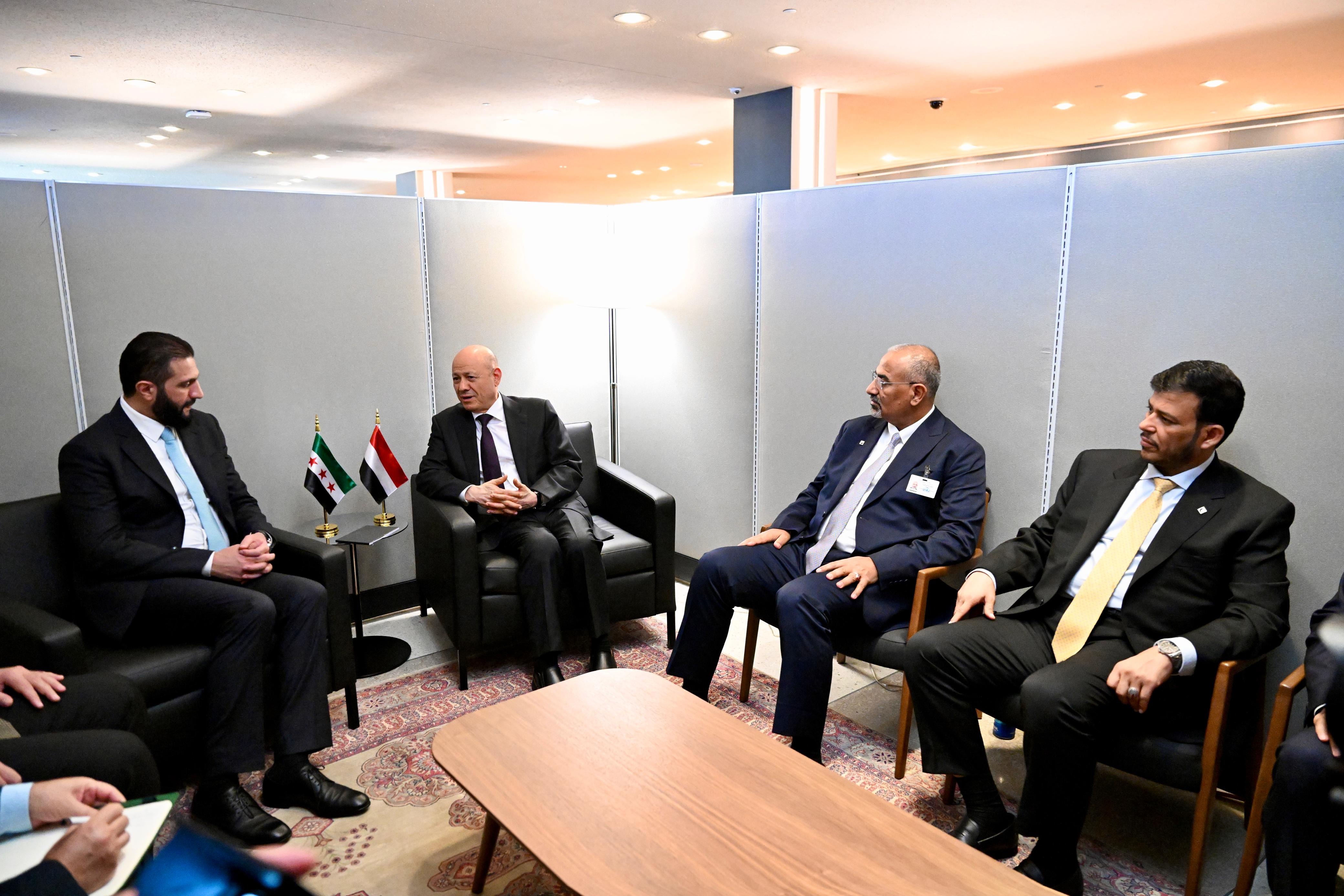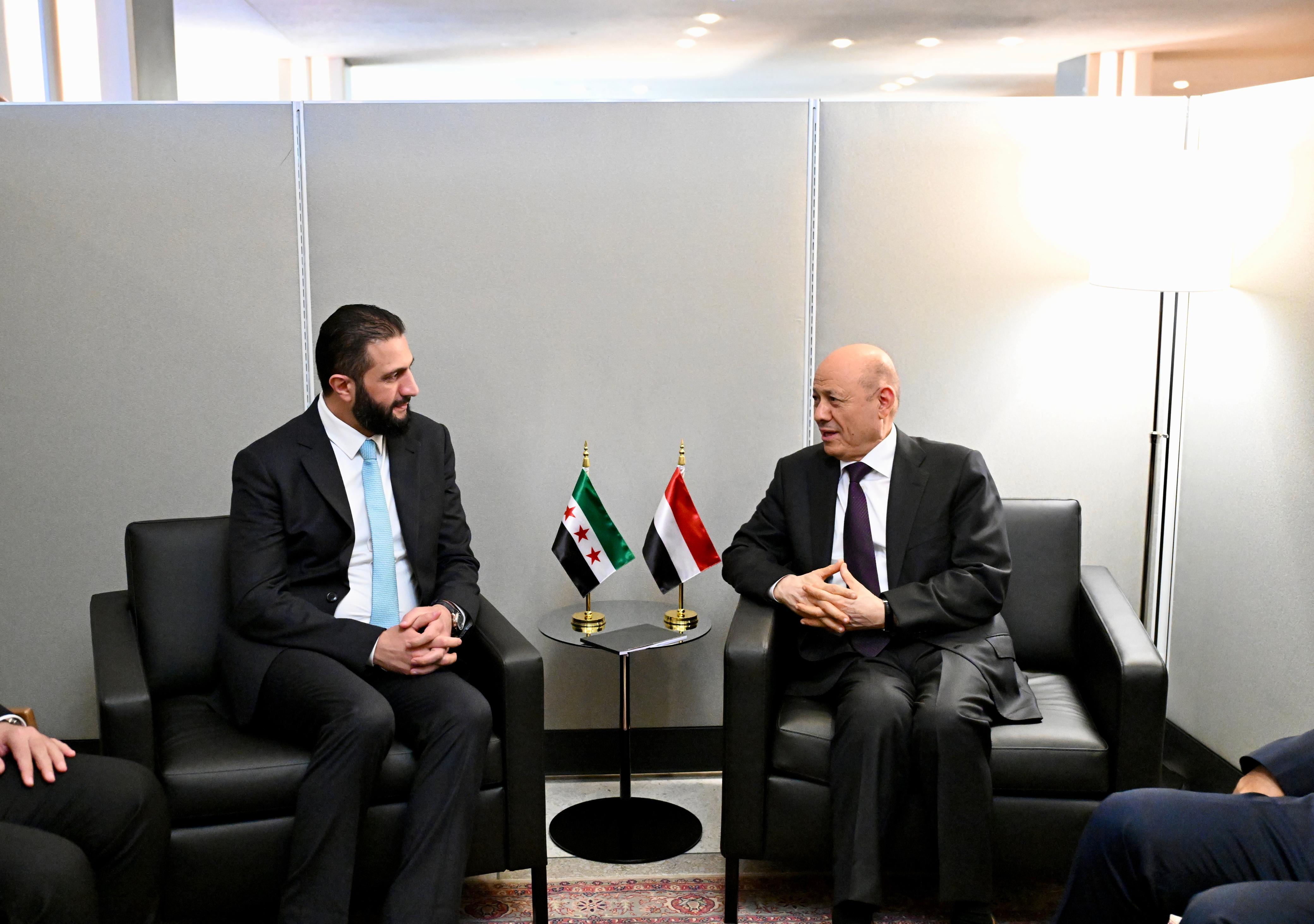 التقى فخامة الرئيس الدكتور رشاد محمد العليمي، رئيس مجلس القيادة الرئاسي اليوم الثلاثاء في نيويورك، ومعه عضوا المجلس اللواء عيدروس الزبيدي، والدكتور عبدالله العليمي، فخامة الرئيس احمد الشرع، رئيس الجمهورية العربية السورية، وذلك على هامش اجتماعات الجمعية العامة للأمم المتحدة.