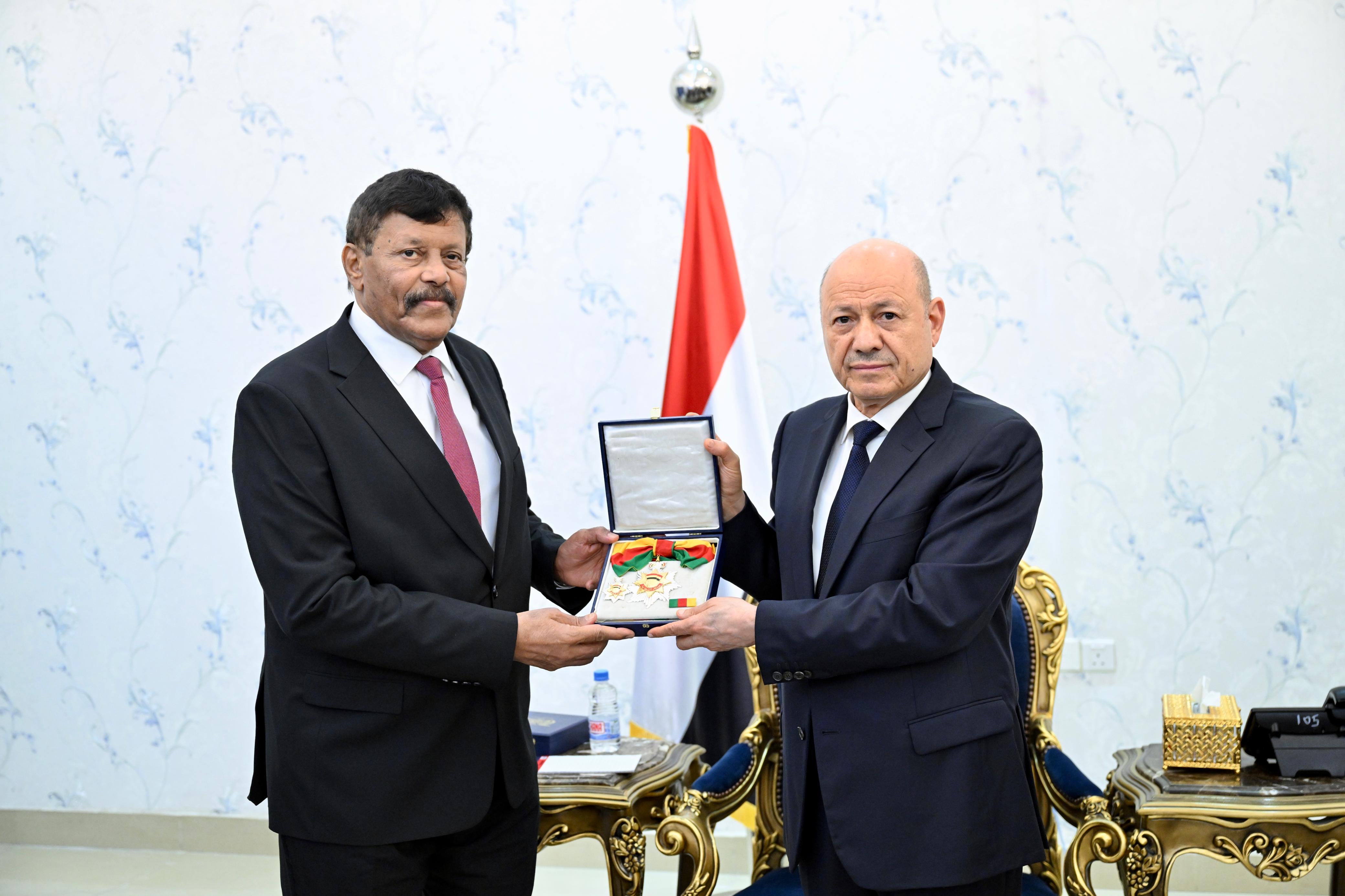 رئيس مجلس القيادة يقلد رئيسي جهازي الأمن السياسي والقومي السابقين وسامي الشجاعة